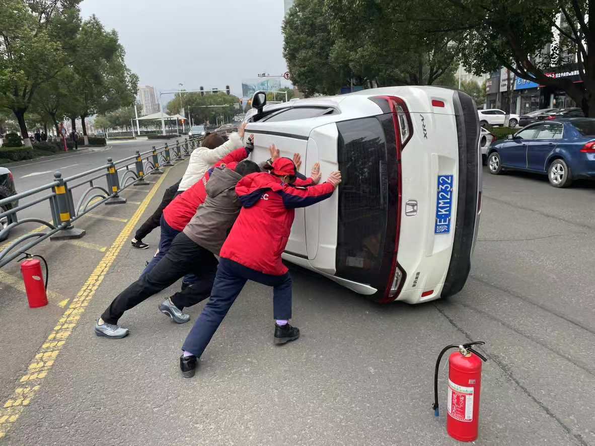 加能站员工谭娟第一时间从站内取来灭火器与消防锥,做好应急准备,并向周边人群呼救。向定明与群众合力撬开车门,确认司机无伤势后,将其安全救出并关闭车辆引擎。随后,谭娟、张继香等人联合现场群众将侧翻车辆推至路边安全区域,避免二次事故发生。